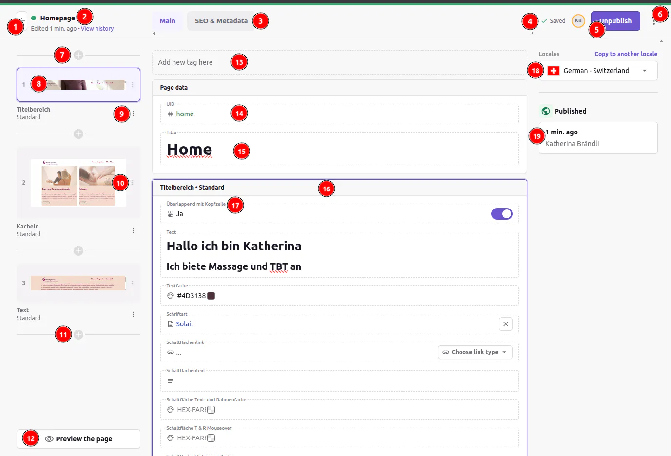 - Das momentan aktive Inhalts-Element. So kannst du schnell auf das entsprechende Element hüpfen, um es in der mittleren Spalte zu bearbeiten.